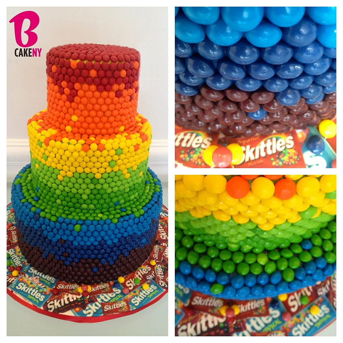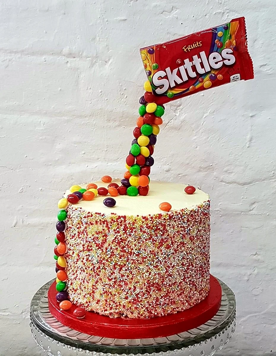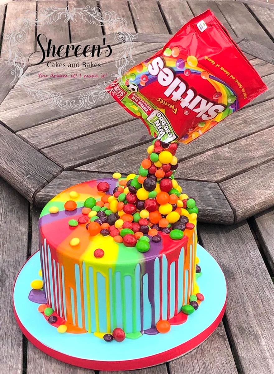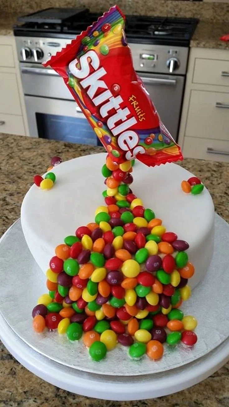 Эти яркие и красочные торты с конфетами Skittles обязательно порадуют детей и взрослых на любом празднике.